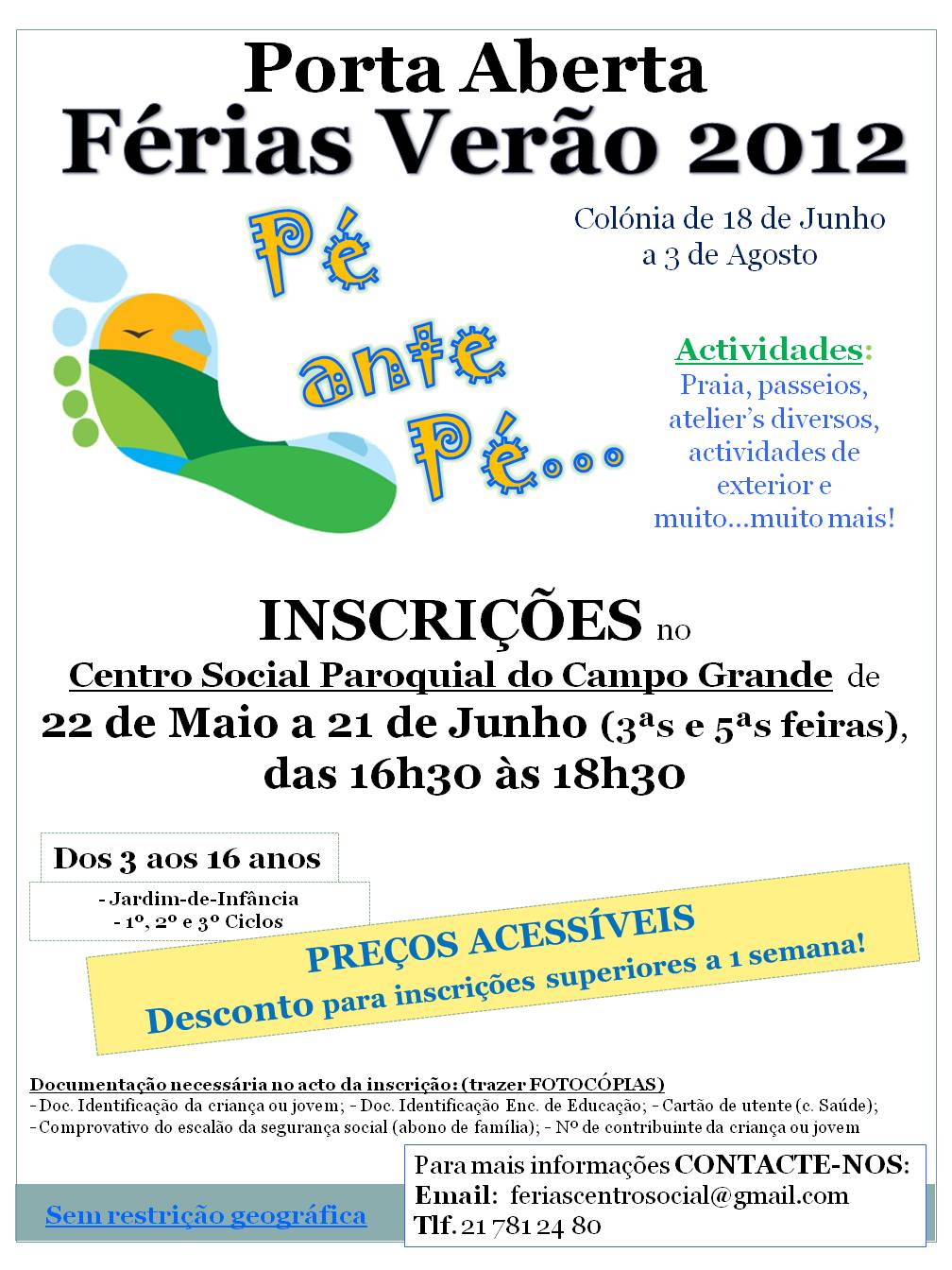 INSCRIÇÕES: De 22 de Maio a 21 de Junho. Todas as 3ª e 5ª feiras, das 16h30 às 18h30. até 15 dias antes da data prevista.